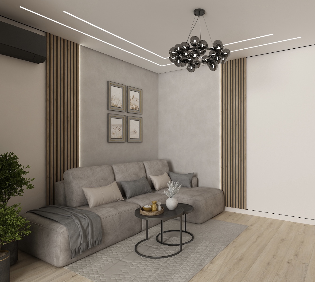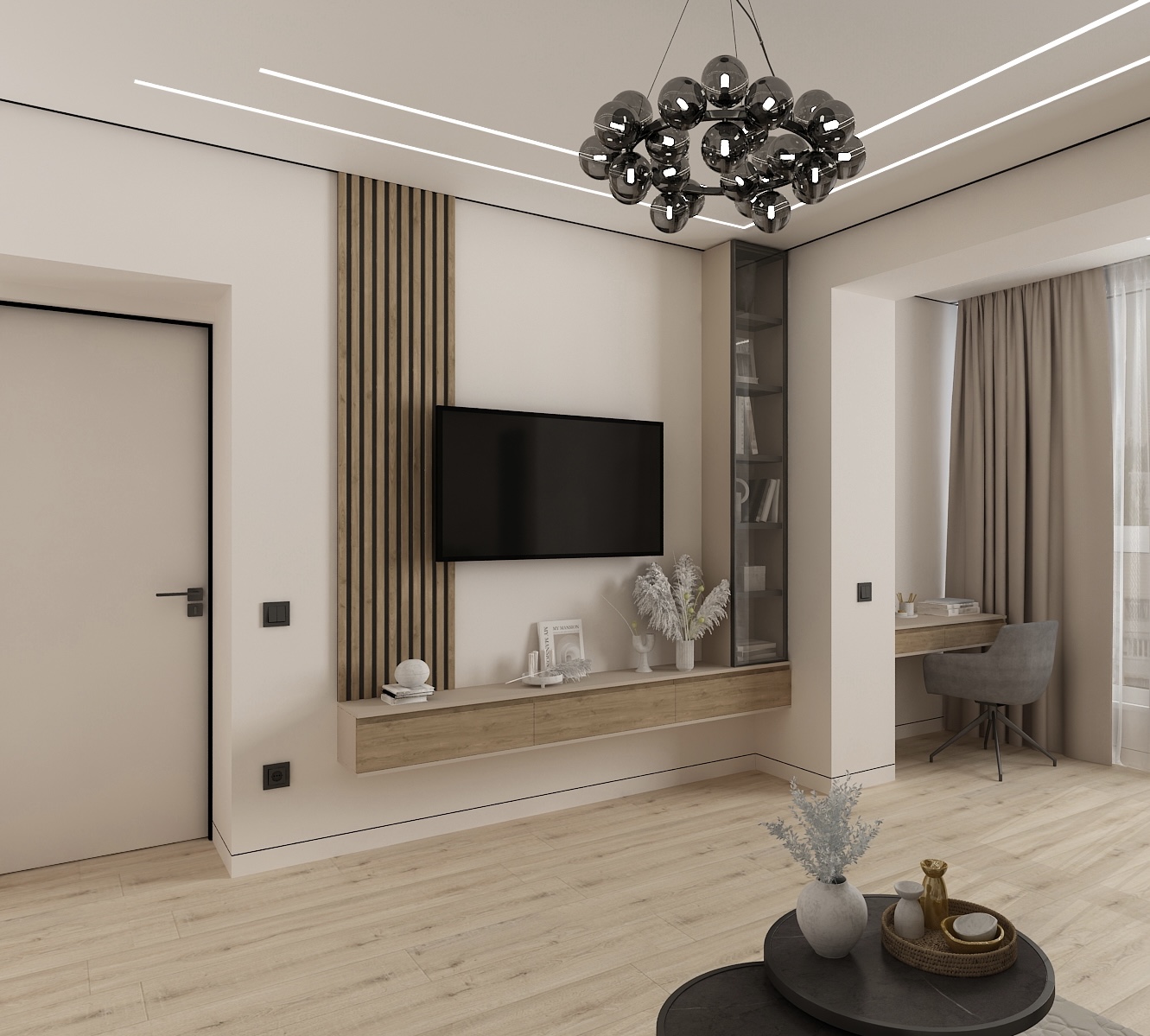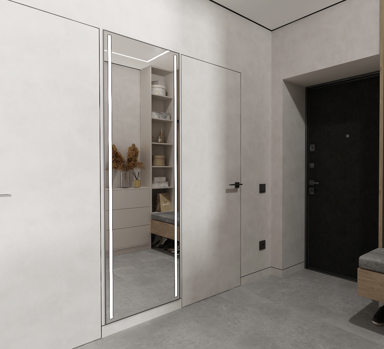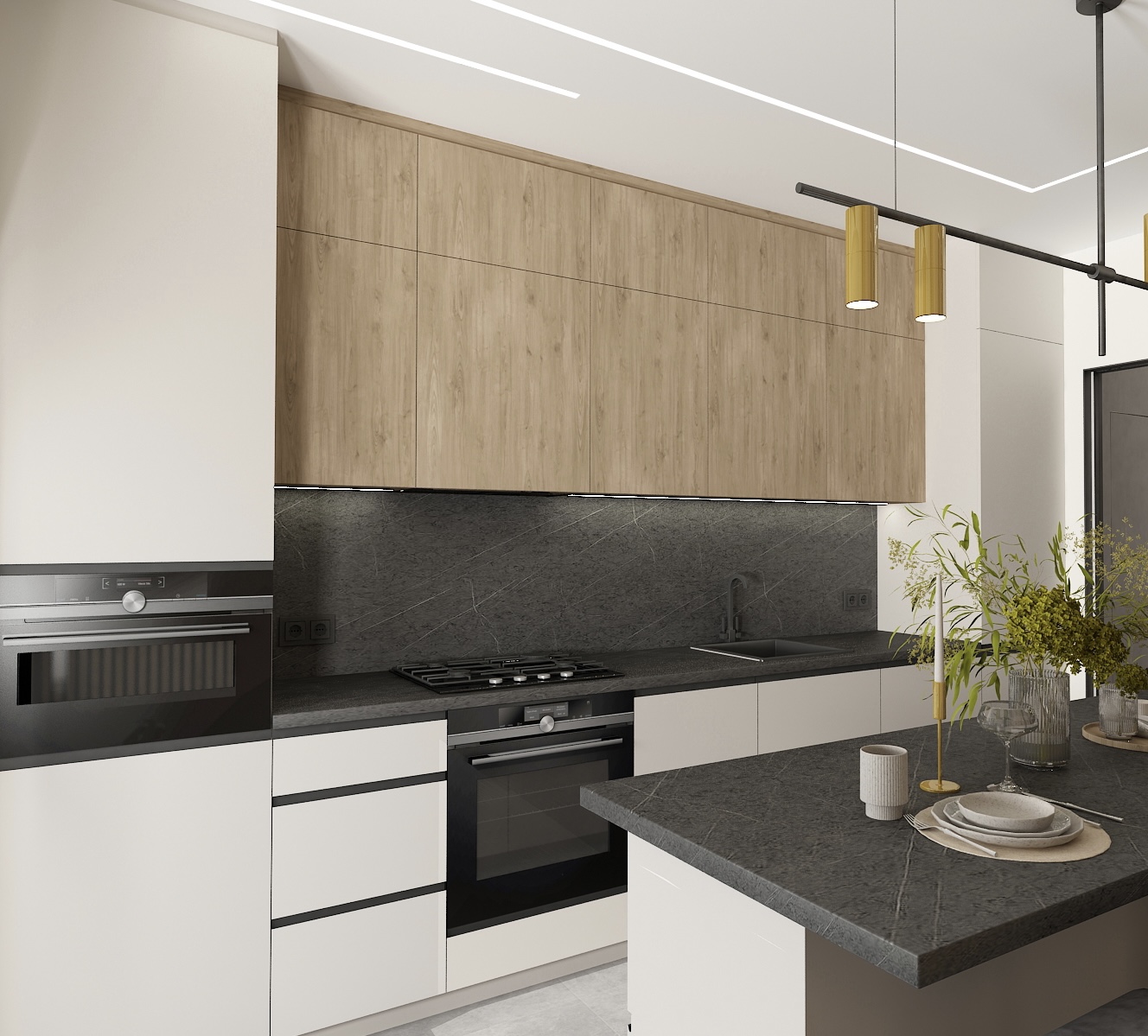 Коридор та кухню розділяє спеціальна розсувна система, що дозволяє як обʼєднати ці приміщення, зробивши загальний простір більшим, так і відділити їх для практичного використання.