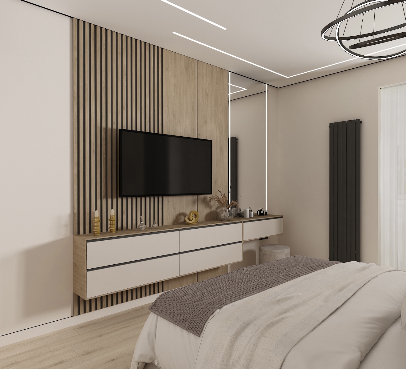 У спальній кімнаті продуманий гардероб, який захований за стіною, що знаходиться позаду ліжка, де кожен з подружжя матиме свій власний вхід та простір.