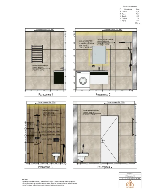Підлога: Залиття напівсухої стяжки; Ламінат (до 1200 грн), кварц вініл (до 2000 грн) або паркетна дошка Барлінек (до 2000 грн); Керамограніт 12060, 12020 .