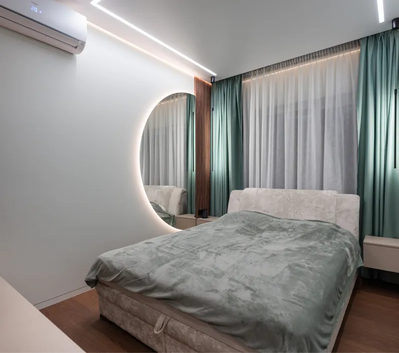 Стеля: Гіпсокартонова з тіньовим профілем; Підсвітка; Моторизовані карнизи.